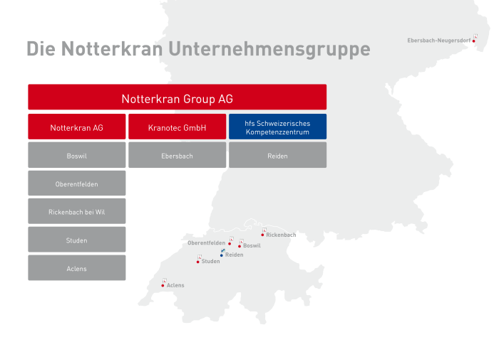Praxislösungen für Ladekrane und Hakengeräte, die überzeugen und begeistern – dafür steht Notterkran. Mit technischem Know-how, ausgeprägter Aufbaukompetenz und über 60 Jahren Erfahrung projektieren, entwickeln und fertigen wir Kran- und Hakengerätelösungen als Komplettlieferant. Die Notterkran Group ist in der Schweiz und Deutschland mit hochspezialisierten Aufbaucentern sowie eigenen Entwicklungs- und Konstruktionsabteilungen aktiv. Als Marktleader und grösster Fahrzeugbauer der Schweiz sind wir ein Familienunternehmen mit mehr als 200 Mitarbeitenden. 2023 feierten wir unser 60-jähriges Jubiläum als innovativer und anerkannter Anbieter am Markt. Neben einer breiten Palette an Kran- und Hakengerätelösungen weltweit führender Hersteller bieten wir auch Eigen- und Speziallösungen wie Brücken oder Schnell-Wechsel-Systeme an.